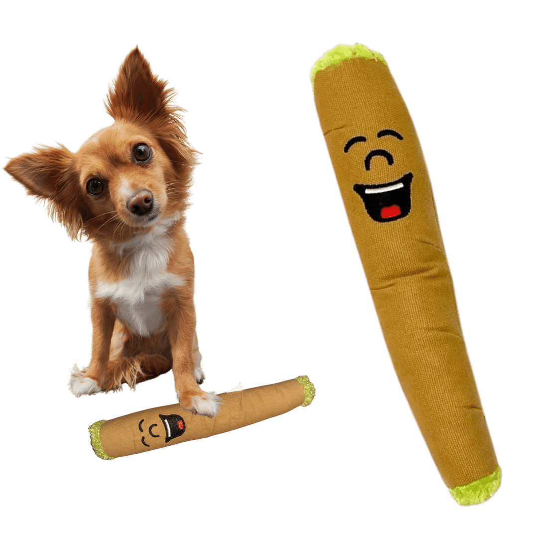 Meet 'B'! His eyes are always closed because he’s blunted all the time! He is made of durable canvas and has a built-in squeaker. He is great for light play or as a funny photo prop. Image your pet with his own 10" blunt!