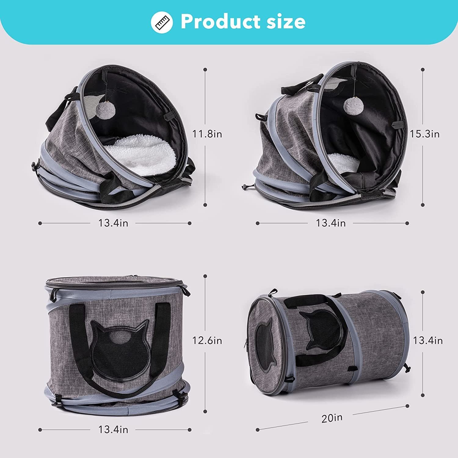 [Product Size]Carrier size: 13.4 x 13.4 x 12.6 inches; Tunnel size: 13.4 x 13.4 x 20 inches ; Bed size: 13.4 x 13.4 x 11.8 inches.
