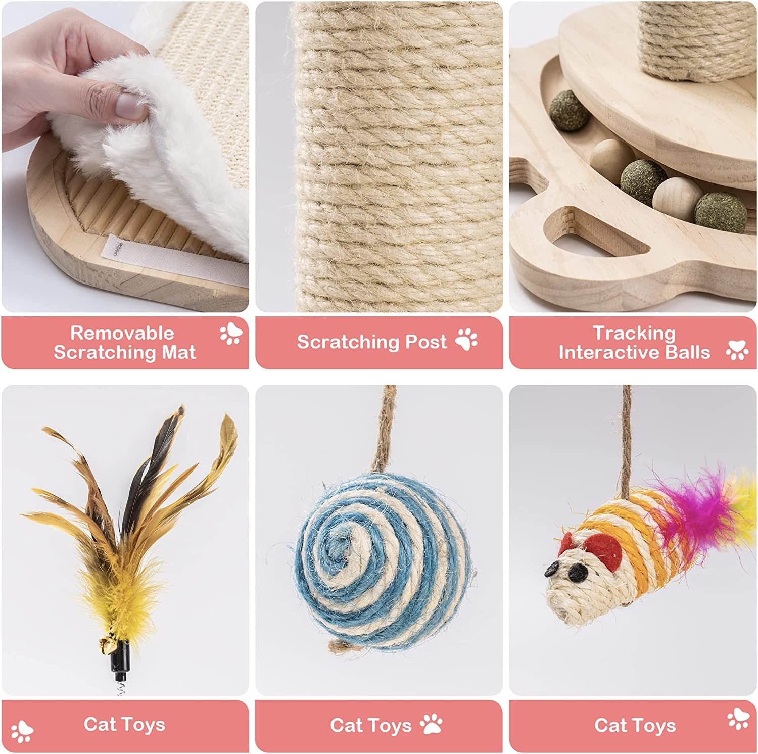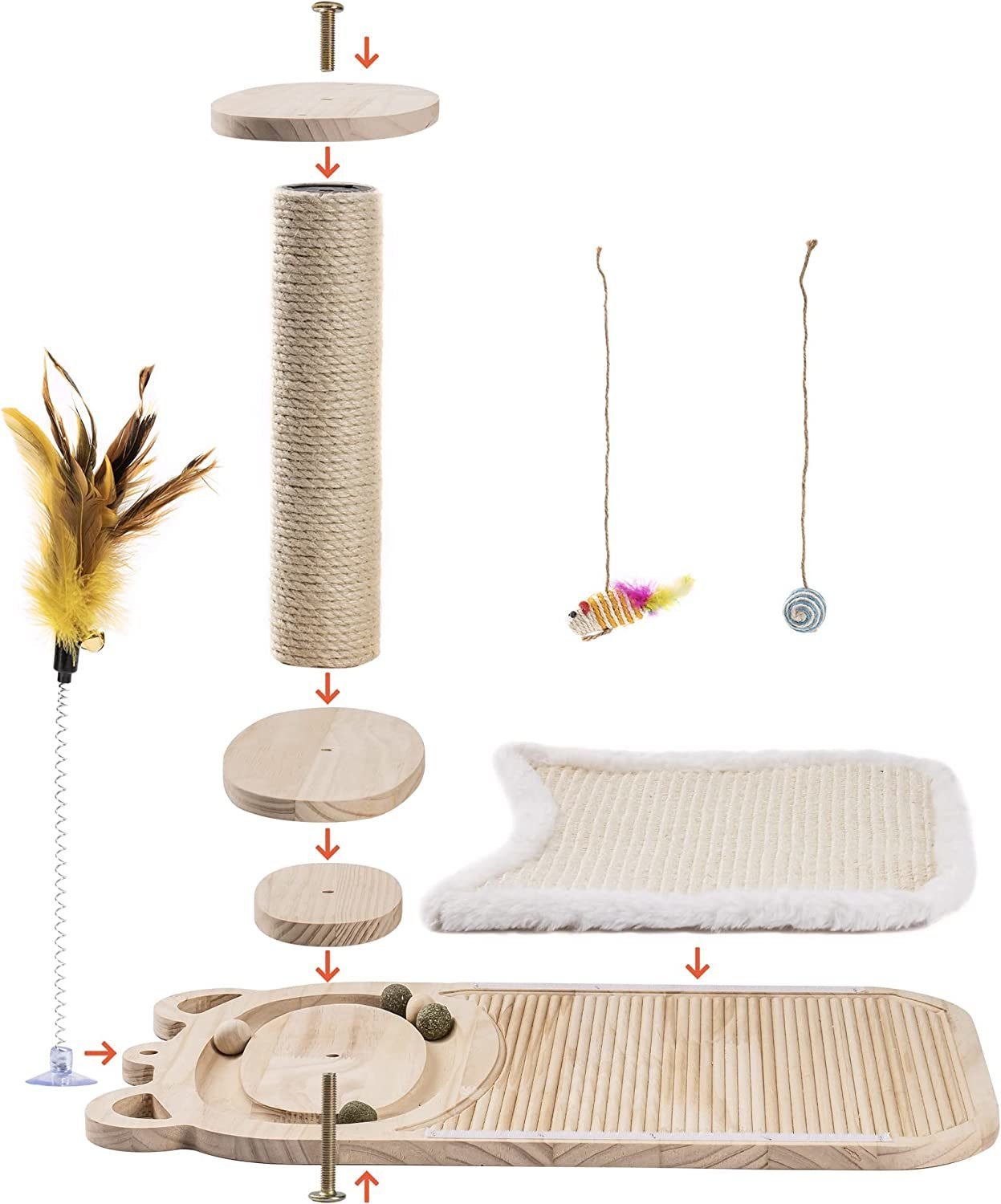 MewooFun 2-LayerCat Tree Scratching Tower Post Scratcher Pet Climbing Rest ToyProductDescription:MewooFunCat Toy 2-Layer Turntable Cat Ball Toywith Feather Stick; Interactive Cat Toy with Eight Interactive Ballsand Two Sisal Dangling Balls; Cat Scratching Post Cat Toyfor Indoor Cats and KittensCharacteristics:Product Name:CatToysBrand:MewooFunMaterial:Sisal; WoodColor:BeigeProduct Size:21.4 x 16 x 14.3 in[Unique design]This product is a combination of cat scratchers and cat toys. Compared to plastic toys; this kitten toys are made of wood; which is sturdy and durable; will not fall over and shake; providing reliability and stability while kittens playing the balls[2-Layer track]This cat ball toy is designed with 2 levels of tracks and 8 moving balls to attract kitty’s attention! there are 2 sisal balls on the top; which can stimulate the cat's hunting desire; attracting cats to bat the ball; swat the ball[Cat Scratching Pole]Cat scratcher Pole is made of natural sisal to satisfy your cats’ natural instinct of climbing and scratching.there is a non-slip pad on the bottom; so it won't scratch up your floors.[Feather Toy]Feather toy with bells to keep your cat active.you can hold it in your hand to tease the cat or use a suction cup to attach it to the floorPackageincludes:1xCatToyNote:1.Small parts should be kept away from children under 3 years old to prevent accidental ingestion; be careful of sharp parts!2.If you have any questions about our products; please feel free to contact us; our customer service will help you solve the problem as soon as possible; thank you for your understanding.