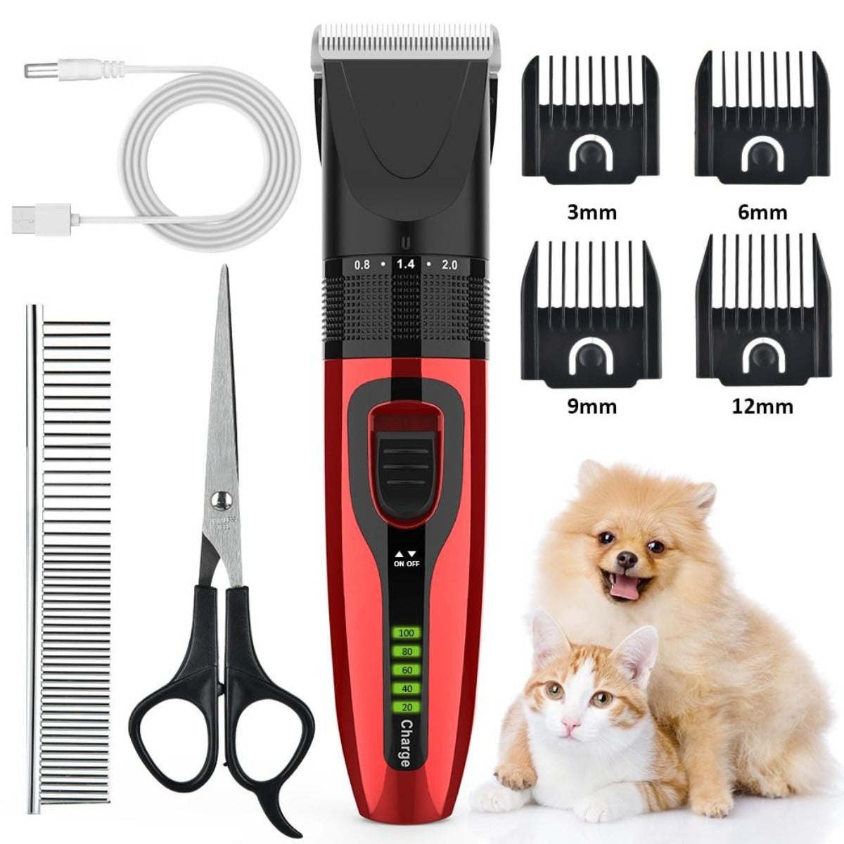 Premium High Quality Dog Trimmer Kit with Scissor and Comb.Give your a Dog or Cat a new hairstyle with this Premium Pet Grooming Set Premium High Quality Dog Trimmer Kit with Scissor and CombFeatures:This clipper set is very handy and easy to use. It can give your pet the best look without going to the grooming salon. -Wireless and RechargeablePet hair clippers will provide you and your pets with excellent cutting experience.-Low noise workingpet clippers for dogs With below 50db noise,Helping the pet feel at ease, not afraid haircut any more.Specifications:Input Power: 100V-240V 50/60HzDimension: 45*185mmCharging time: 3-5 hoursUsing time: 1-2 hoursColor: Red and BlackPackage Included:1 * Pet Clipper(include battery)1 * USB Charger Cable4 * Comb Attachments(3-6-9-12mm)1 * Flat Scissor1 * Stainless Steel Comb1 * User Manual