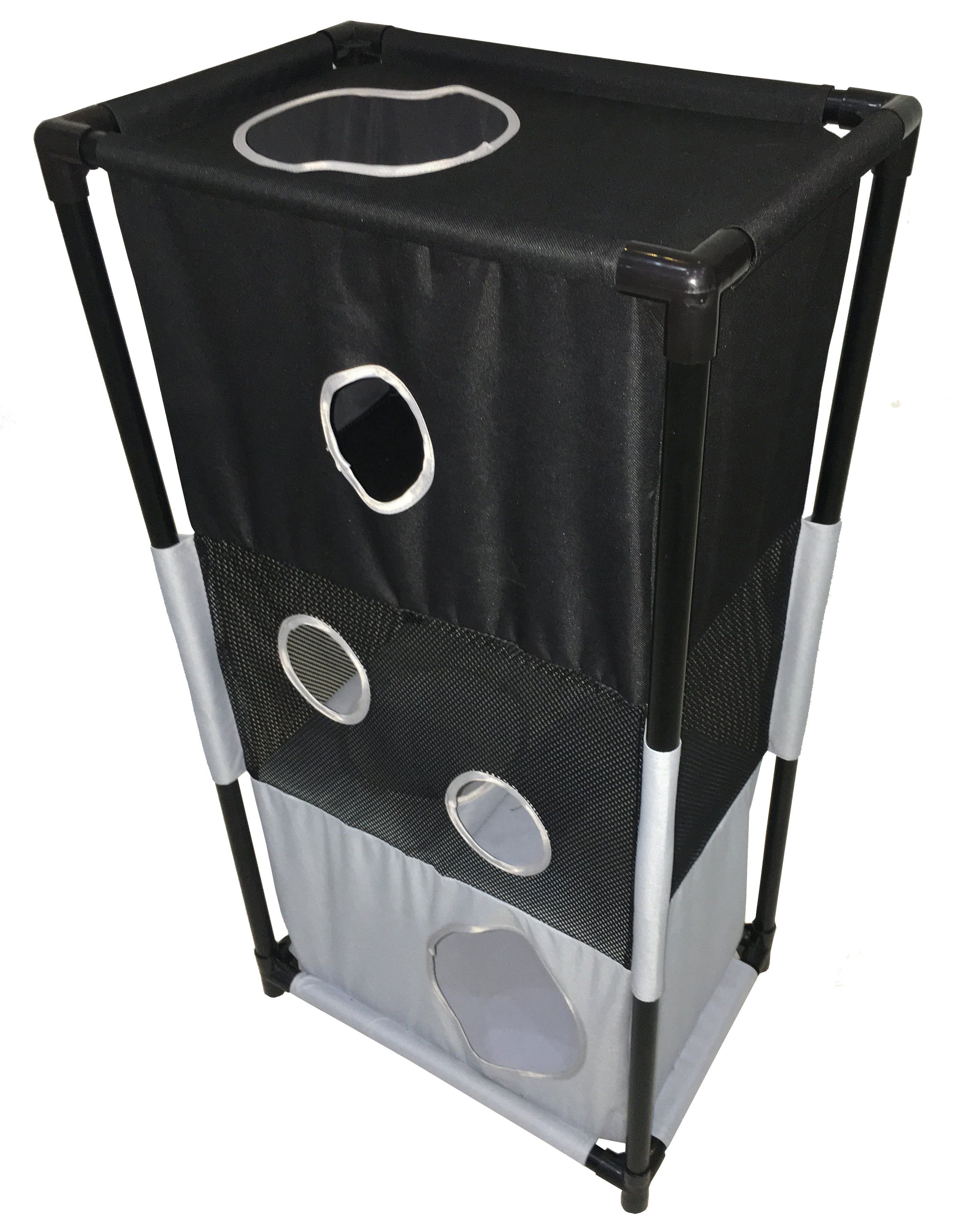 The Pet Life Kitty-Square obstacle soft folding sturdy collapsible travel cat house is composed of durable Ballistic Nylon and Mesh with inner-seat belt webbed stitching for added durability. The Kitty-square features numerous hole entrances at the bottom, mezzanine and top levels. Perfect for Cat Interactive play, this life-sized cat puzzle house is easily collapsible and perfect for traveling and easy setup. Less bulkier than the bulkier conventional cat houses, this cat house is both lightweight and great for storage. Great for multiple cats and great for brain activity development. Assembles in minutes, these poles easily connect into place and sturdy enough to carry up to 200 Lbs. of weight. Perfect for both indoor and outdoor usages. Features 3 levels of playful fun, great for napping or lounging. Available in Multiple Colors.