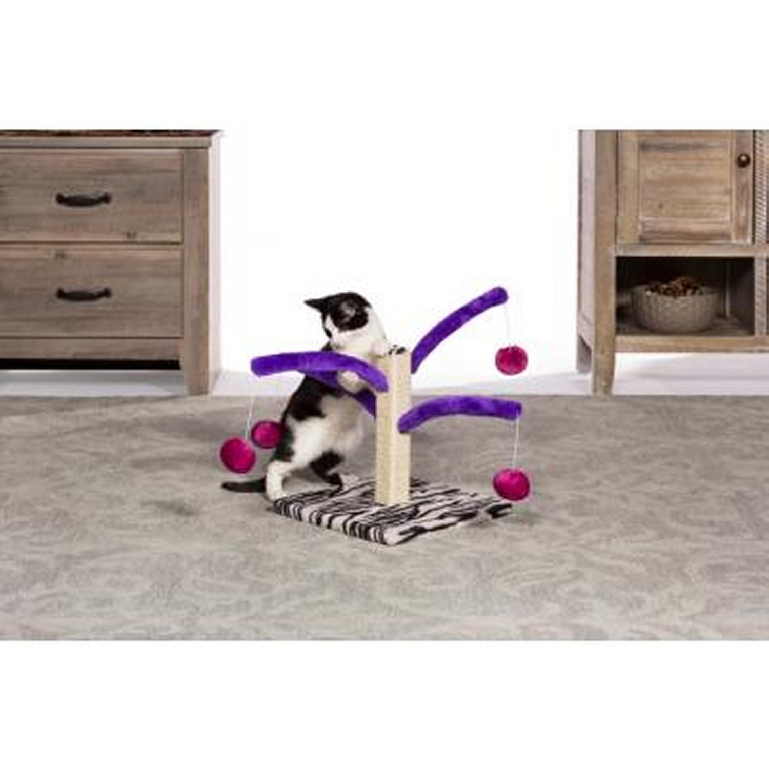Prevue Pet Products Kitty Power Paws Bounce 'n Spring Scratcher is a playful cat scratcher with jute scratching post that also features four colorful spring arms with dangling plush toys. The scratching post helps to save your furniture from your cat's more destructive natural instincts, while the dangling plush toys encourage active play. 22"L x 22"W x 12"H. Base is 11 3/4"L x 11 3/4"W.