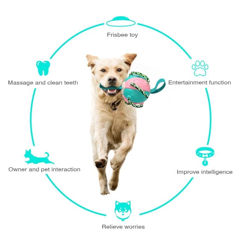 [Multifunctional outdoor dog toy]:  This is a multifunctional fun toy that combines a bounce back frisbee ball, interactive training ball, teething ball, tug of war toy and outdoor sports entertainment for multiple playtime fun for your dog.